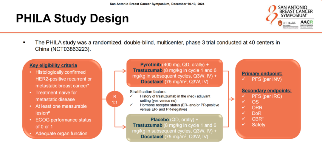 [2]、Binghe Xu,et al.“Pyrotinib or placebo in combination with trastuzumab and docetaxel for untreated HER2-positive metastatic breast cancer(mBC):prespecified final analysis of progression-free survival(PFS)of the phase 3 PHILA trial.”2024 SABCS Abstract GS1-03.