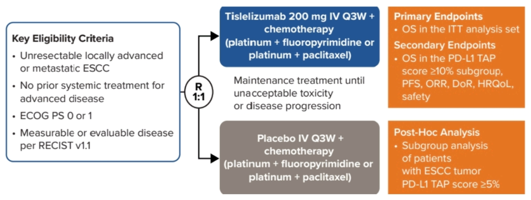 RATIONALE-306研究(NCT03783442)是一项随机、双盲、全球多中心III期研究(图1)。该研究招募了649例不可切除的局部晚期或转移性ESCC患者,要求ECOG体力状态评分为0或1分、既往未接受过针对晚期阶段的系统性治疗、根据RECIST v1.1标准具有可测量或可评估的病灶。患者被等比例随机分配至两组,干预组接受替雷利珠单抗(200mg IV Q3W)联合化疗,对照组接受安慰剂(IV Q3W)联合化疗,持续治疗至不可耐受毒性或疾病进展。主要终点为意向治疗(ITT)人群OS,次要终点包括PD-L1 TAP≥10%亚组OS、无进展生存期(PFS)、客观缓解率(ORR)、缓解持续时间(DoR)、生活质量(HRQoL)及安全性。此外,该研究还特别策划了对PD-L1 TAP评分≥5%的ESCC患者亚组进行事后分析(Post-hoc analysis)。