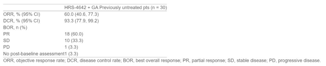 研究纳入KRAS G12D突变晚期PDAC患者,接受HRS-4642(第1天500 mg,第8天1200 mg,静脉注射,Q3W)联合GA(吉西他滨1000 mg/m2第1、8天,白蛋白紫杉醇125 mg/m2第1、8天,静脉注射,Q3W)。截至2025年4月10日,研究共入组31例患者,其中1例为既往接受过治疗的患者,30例为初治患者。中位随访4.4个月时,83.9%患者仍在治疗中,1例既往治疗患者经研究治疗后,疾病稳定超过7个月且持续治疗,初治患者cORR达60.0%(95%CI:40.6%~77.3%),18例应答者中有17例持续应答,中位缓解持续时间尚未成熟,30例初治患者中仅3例(10.0%)疾病进展,PFS数据也尚未成熟(表2)。