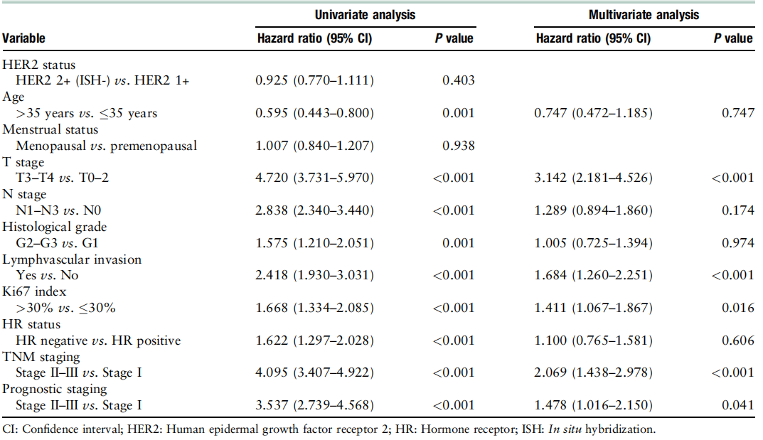 研究方法:收集了2015年1月至2016年12月中华医学会外科学分会乳腺外科学组单位经治的早期HER2低表达表达乳腺癌患者的临床病理资料及预后资料。对影响患者预后的因素进行分析。