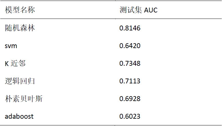 共1915例患者纳入模型建立及验证,包含209例复发转移病例和1534例无复发转移病例纳入研究。采用随机森林模型、SVM、KNN、logistic回归、NBM、AdaBoost等6种预测模型(图4)。随机森林模型具有最高的AUC,并被选择为最终的复发预测模型。