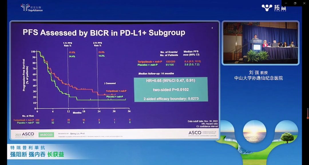 2023年ASCO大会公布的最新数据显示:与注射用紫杉醇(白蛋白结合型)相比,特瑞普利单抗联合注射用紫杉醇(白蛋白结合型)用于首诊IV期或复发转移性TNBC患者可显著延长PD-L1阳性人群的无进展生存期(PFS),BICR评估的中位PFS分别为8.4 vs 5.6个月,疾病进展或死亡风险降低35%(HR=0.65,95%CI:0.47~0.91,双侧P=0.0102)。